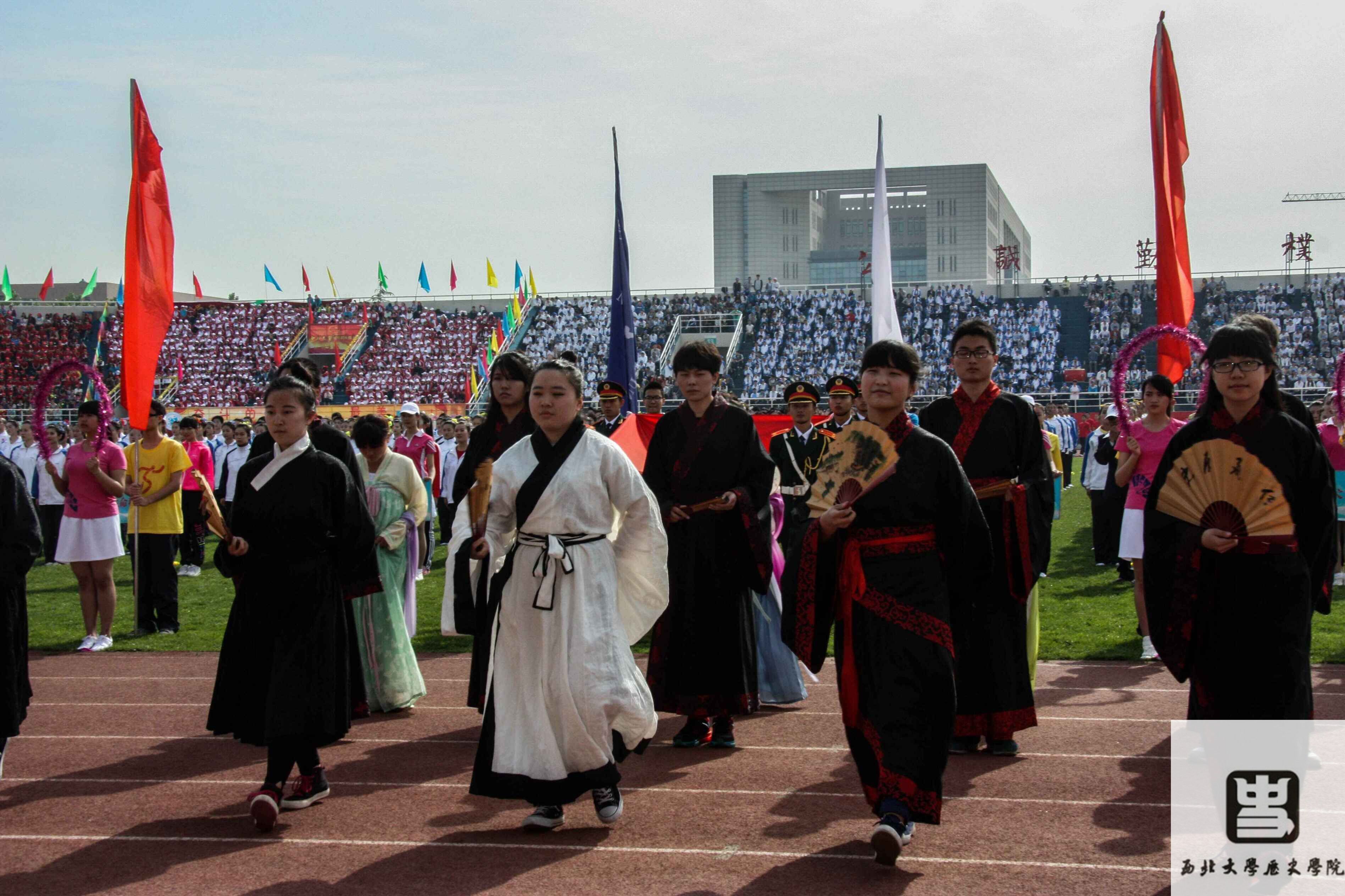 422日,2015年西北大学首届体育文化节暨田径运动会正式开幕。上午,西北大学776net必赢官网同学先后在队列展示和两操比赛中为大家展示了古色古韵的汉服和动作流畅、整齐化一的广播操。