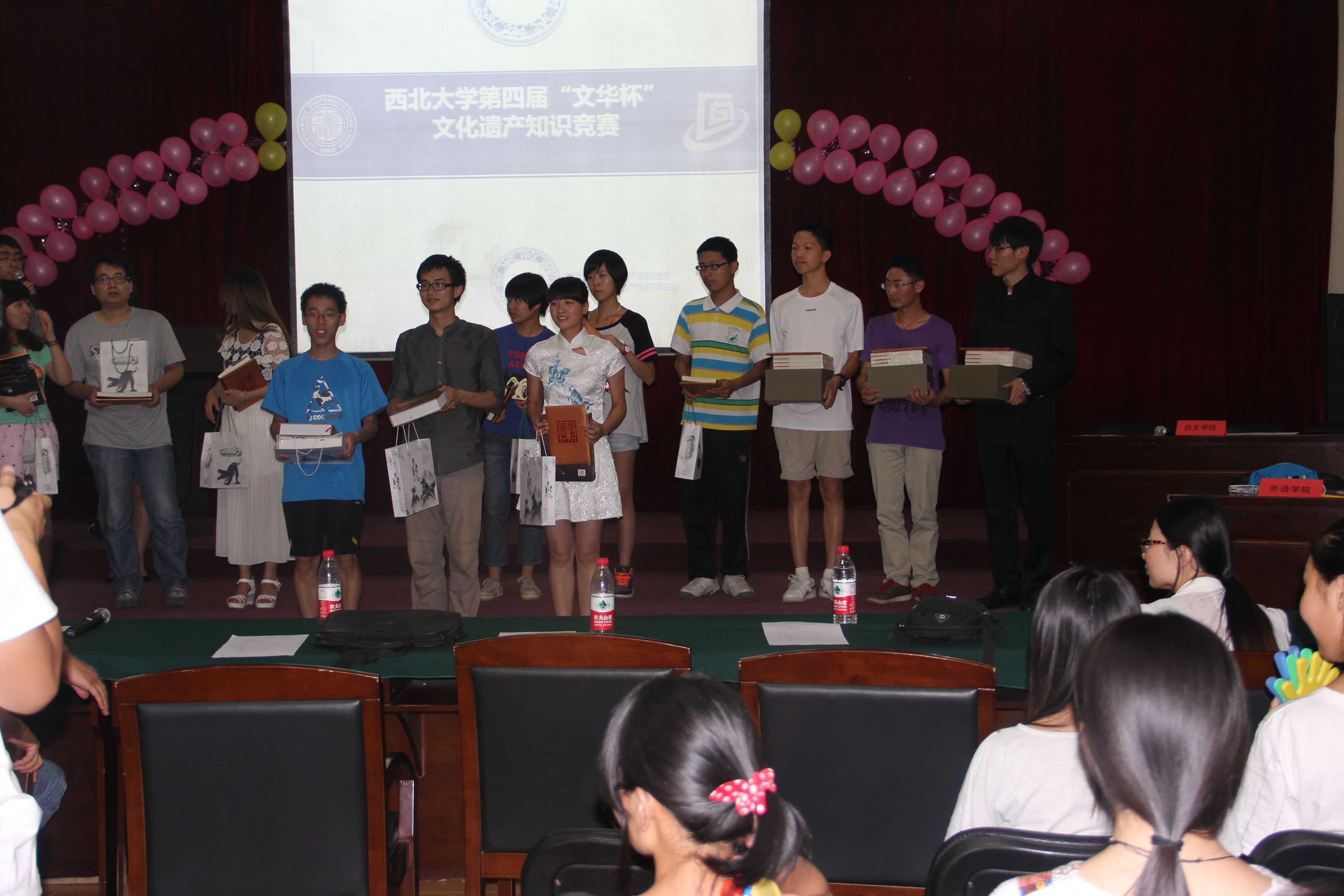 201469日晚,在西北大学文化遗产学院举办的第四届“文华杯”知识竞赛决赛中,776net必赢官网由赵浩然、吴樾、吴贵飞三位同学组成的代表队,一路过关斩将,以总积分403分第一名的成绩为我院勇夺冠军。