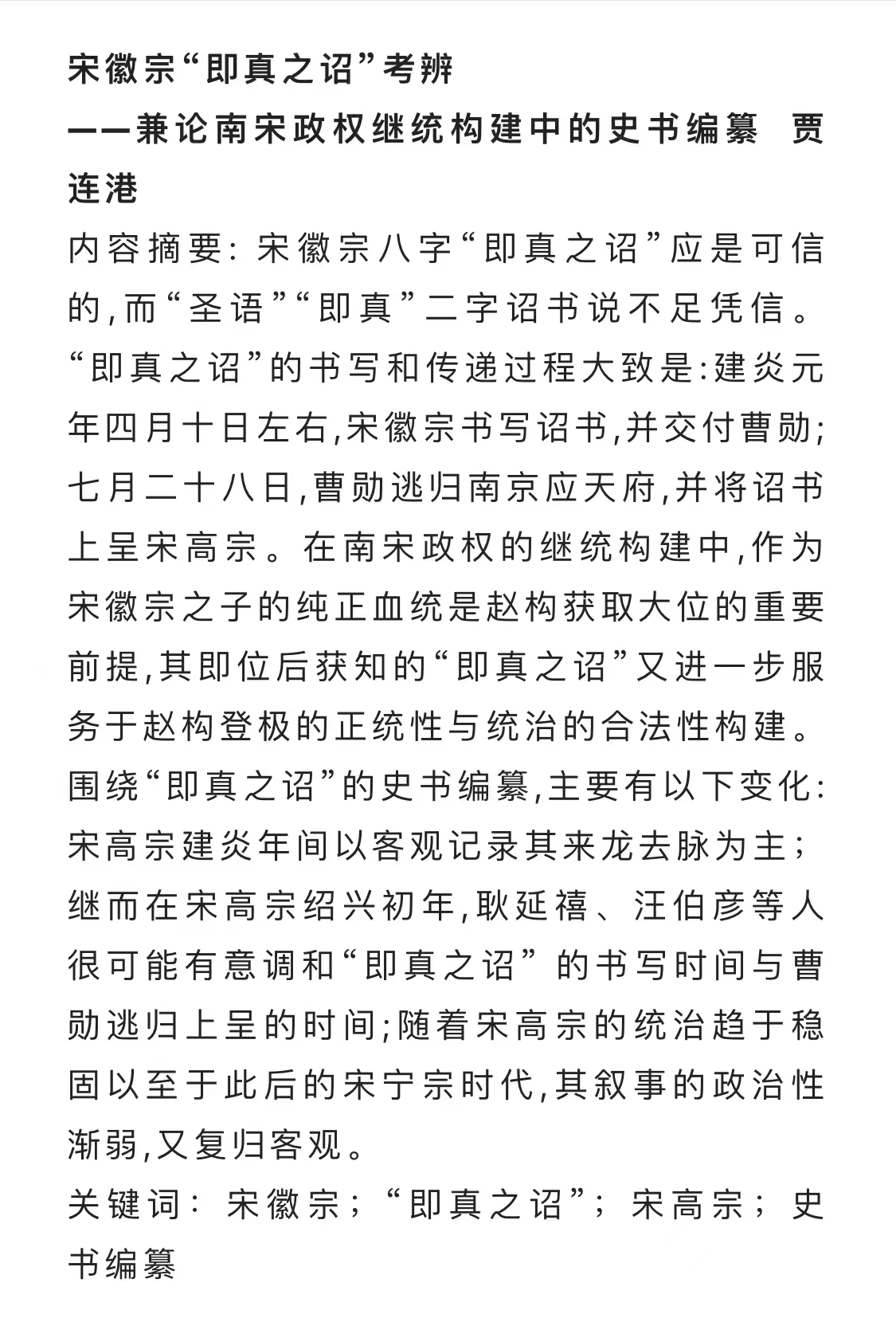 近日,贾连港副教授在《文献》2023年第2期发表了题为《宋徽宗“即真之诏”考辨——兼论南宋政权继统构建中的史书编纂》的文章。